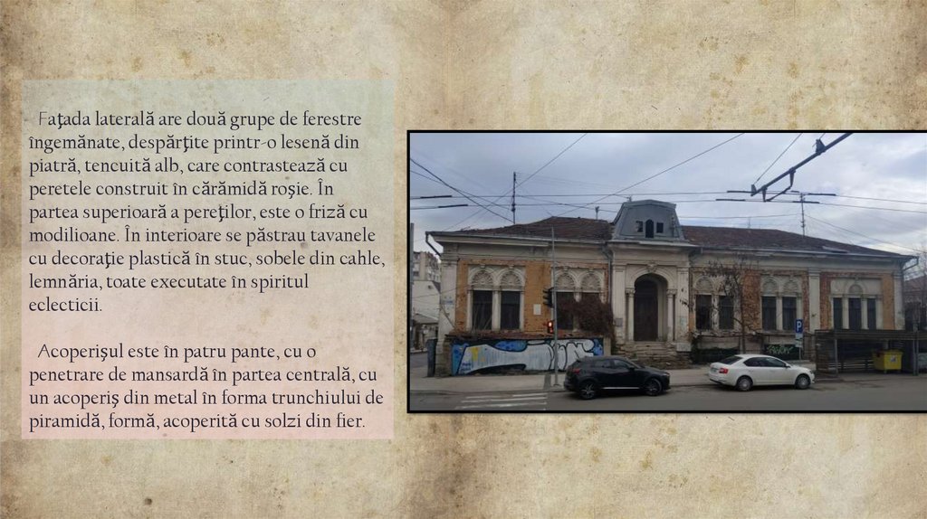 Faţada laterală are două grupe de ferestreîngemănate, despărţite printr-o lesenă din