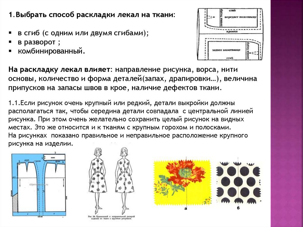 На раскладку лекал влияет: направление рисунка, ворса, нити