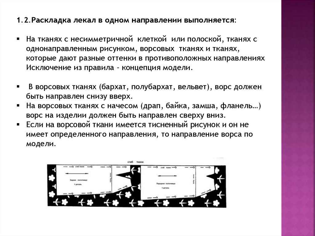 1.2.Раскладка лекал в одном направлении выполняется:На тканях с несимметричной клеткой или полоской, тканях с