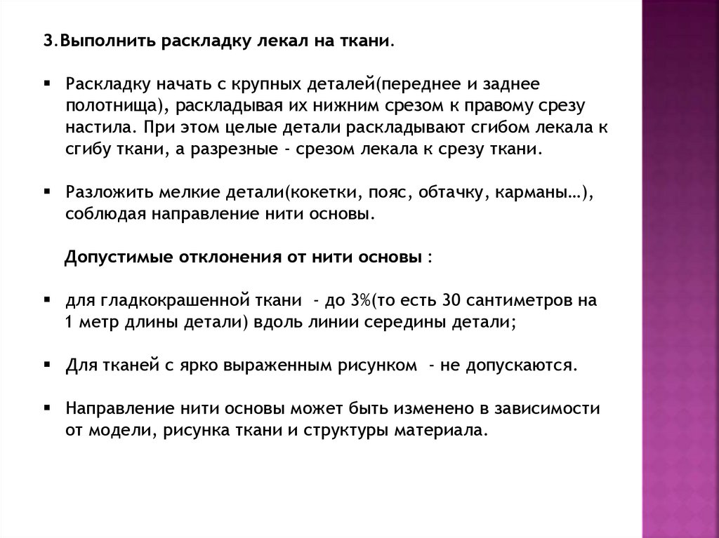 припусков на запасы швов в крое, наличие дефектов ткани.
