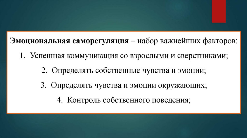 Эмоциональная саморегуляция – набор важнейших факторов:1. Успешная коммуникация со взрослыми и сверстниками;