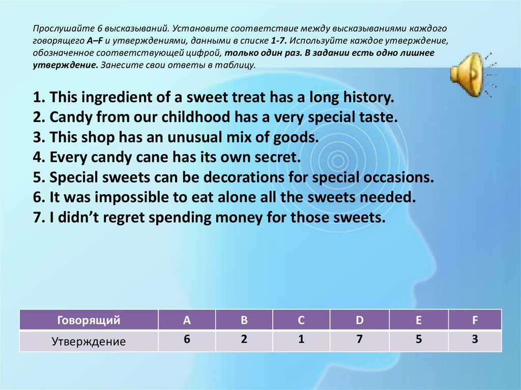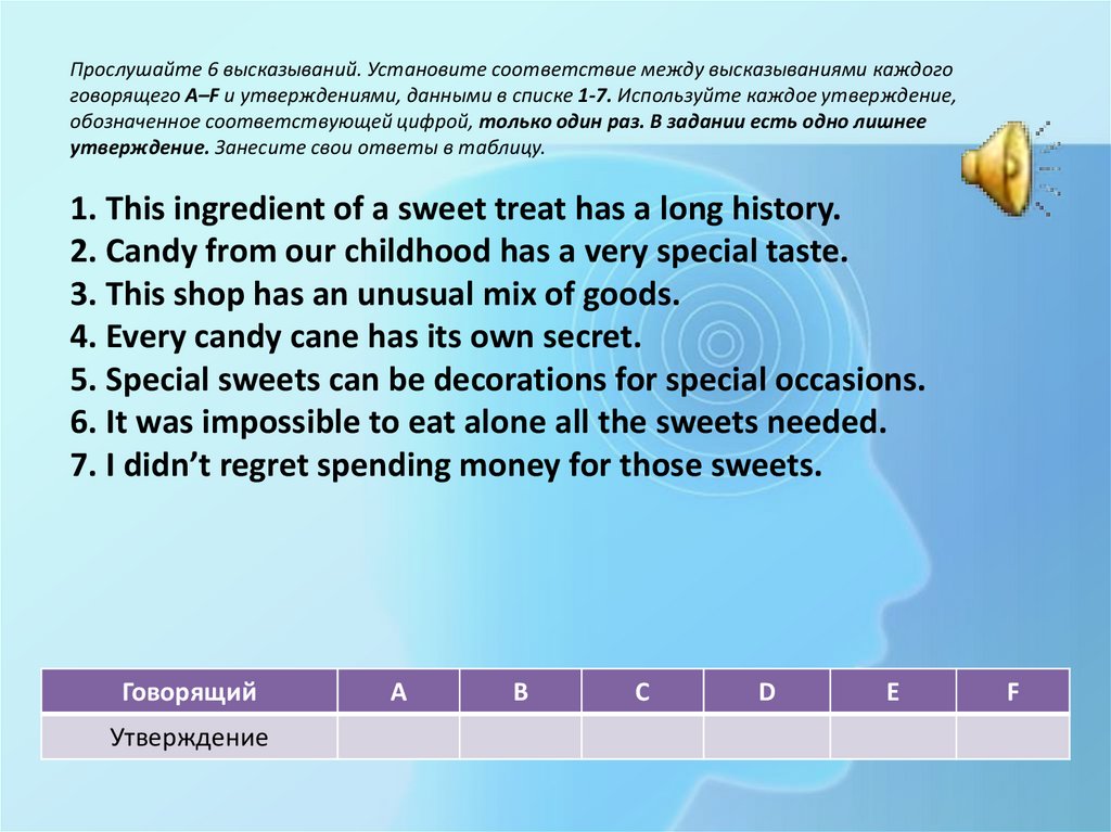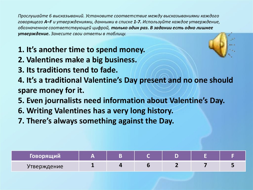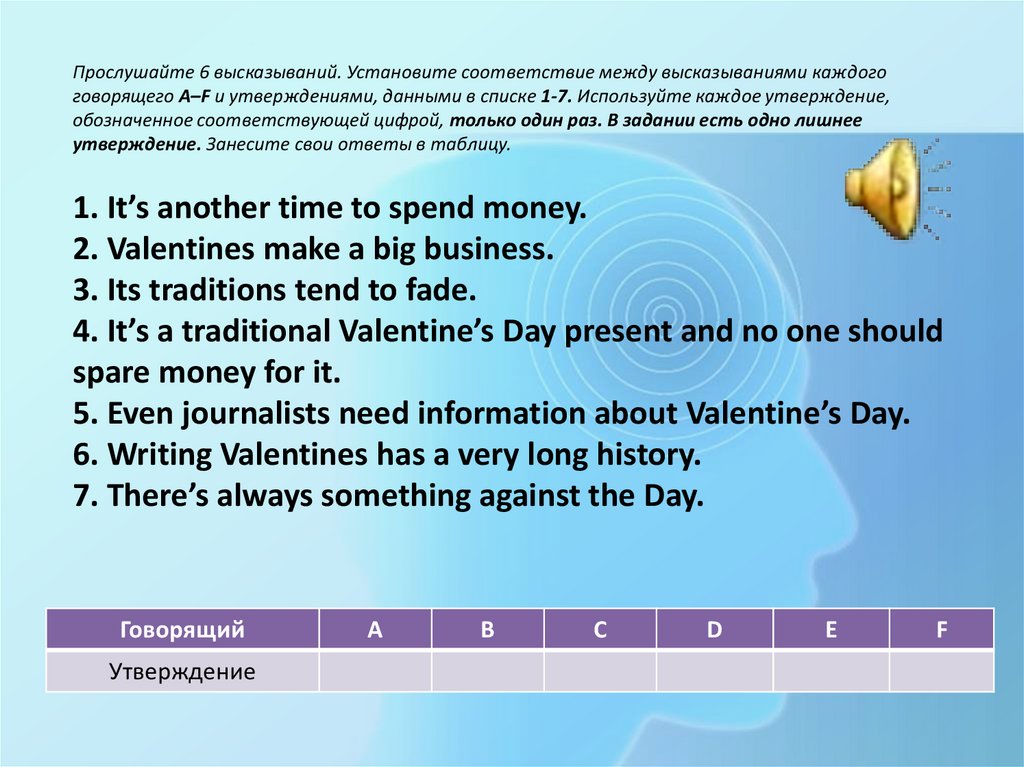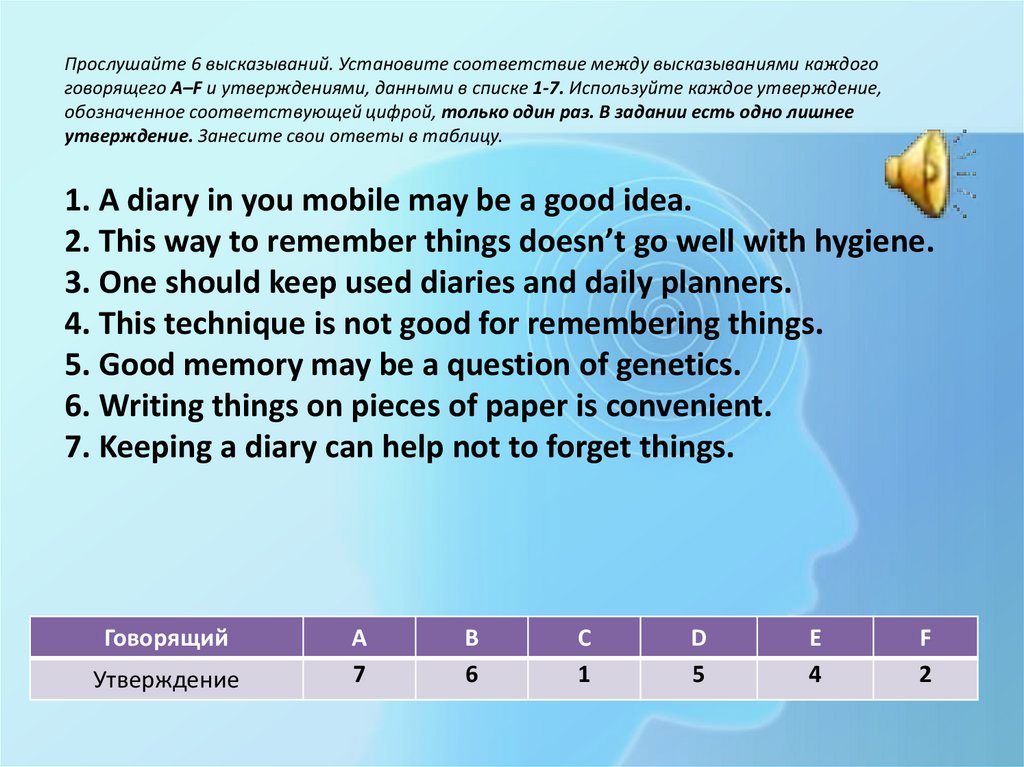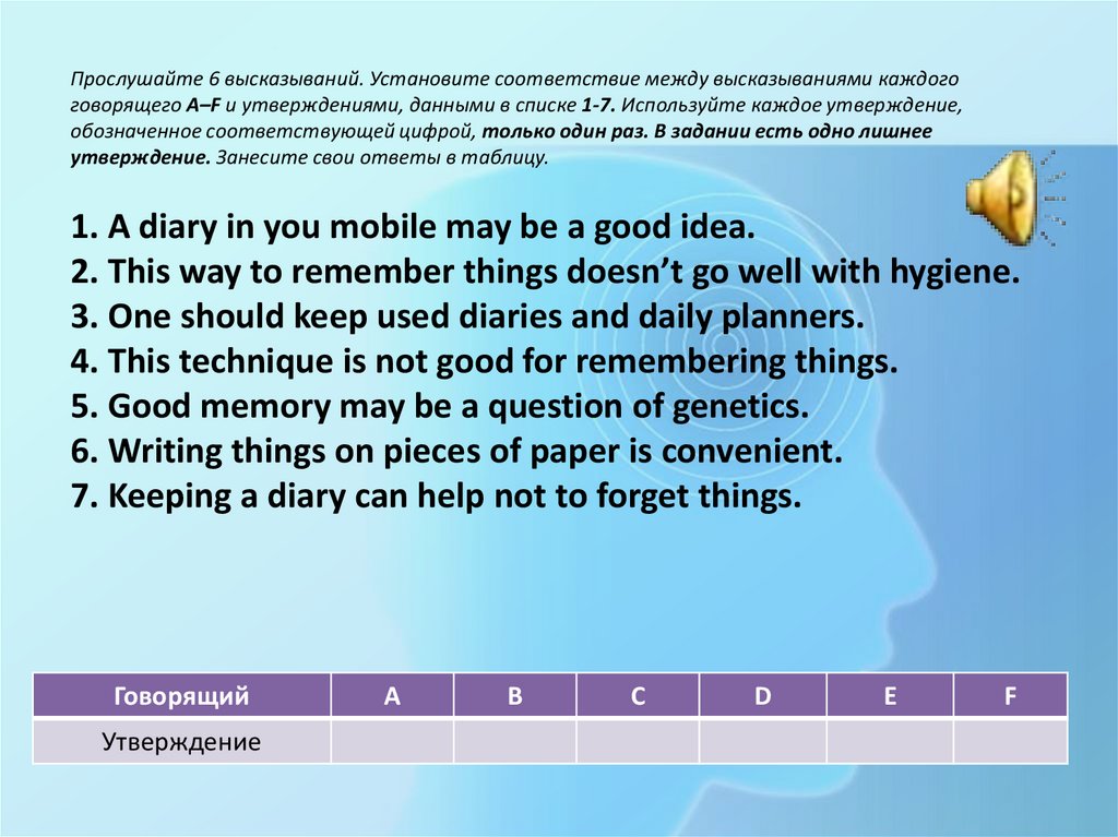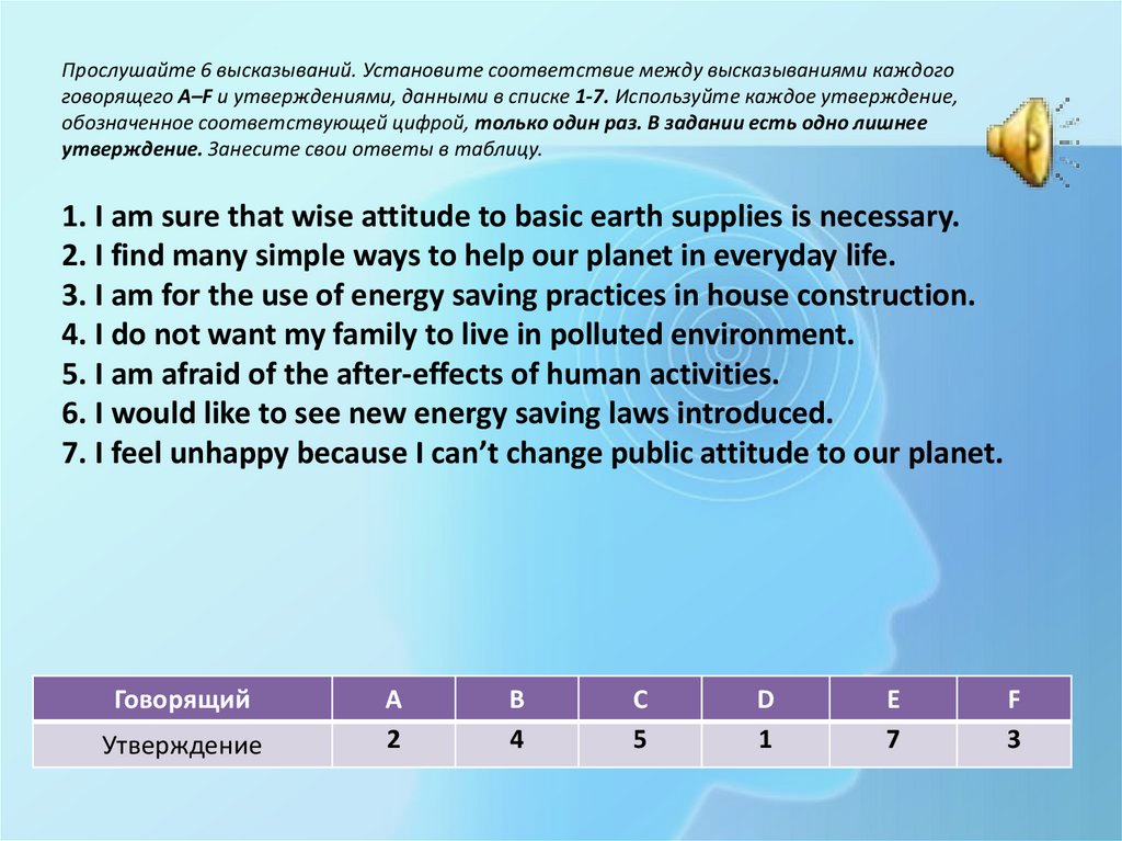 Прослушайте 6 высказываний. Установите соответствие между высказываниями каждогоговорящего A–F и утверждениями, данными в списке 1-7. Используйте каждое утверждение,