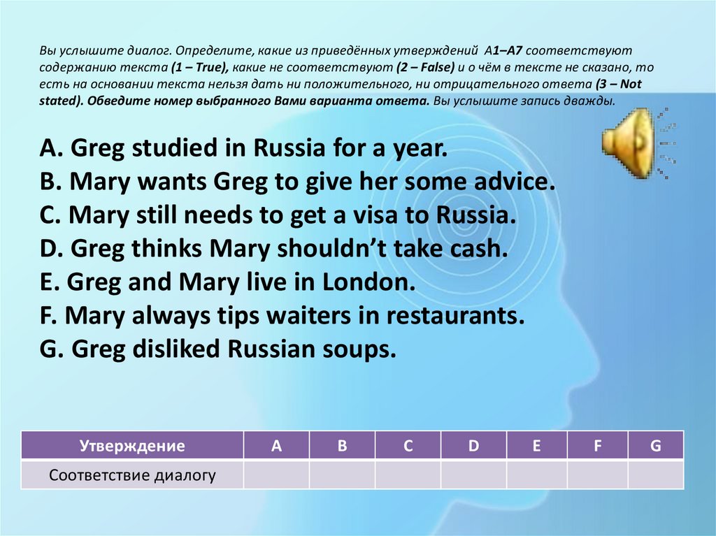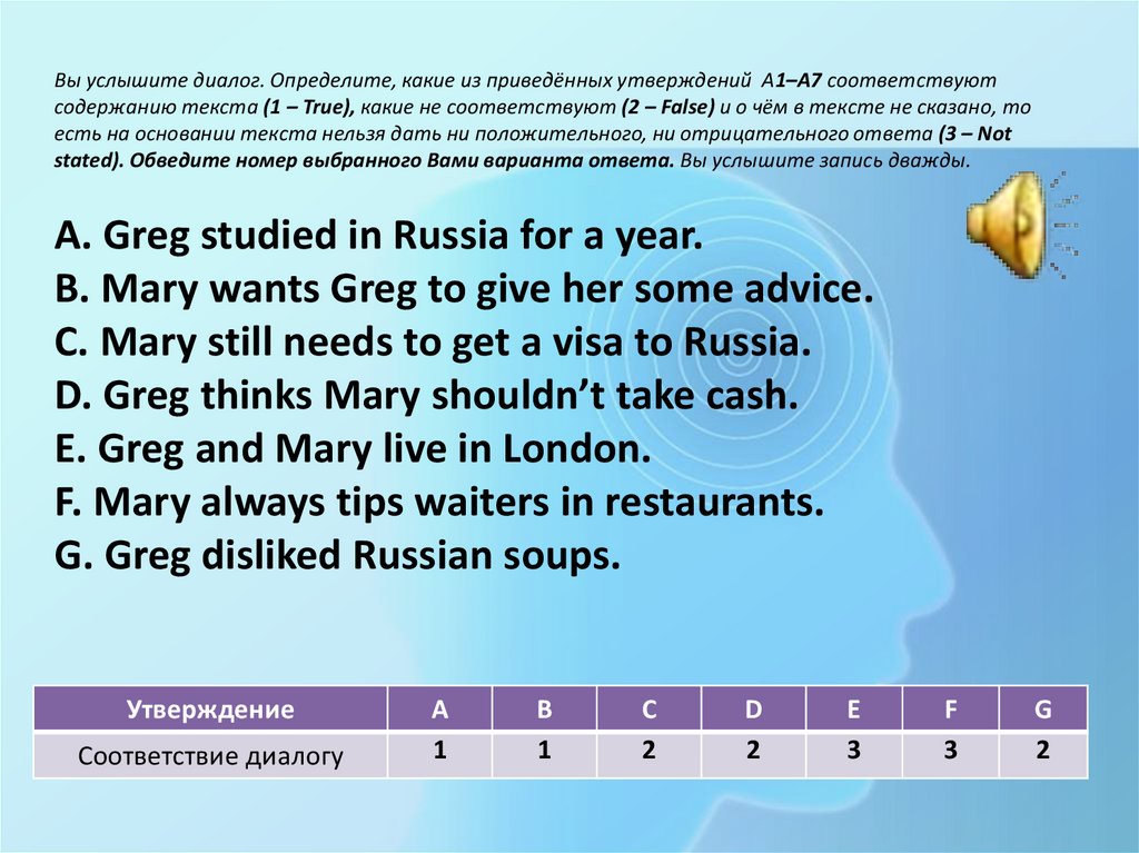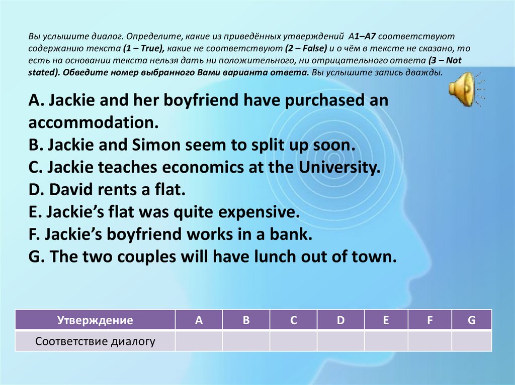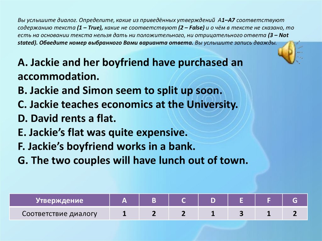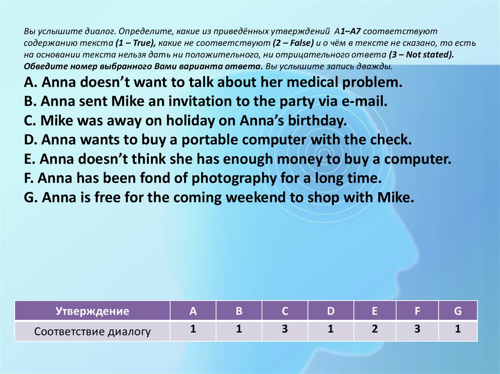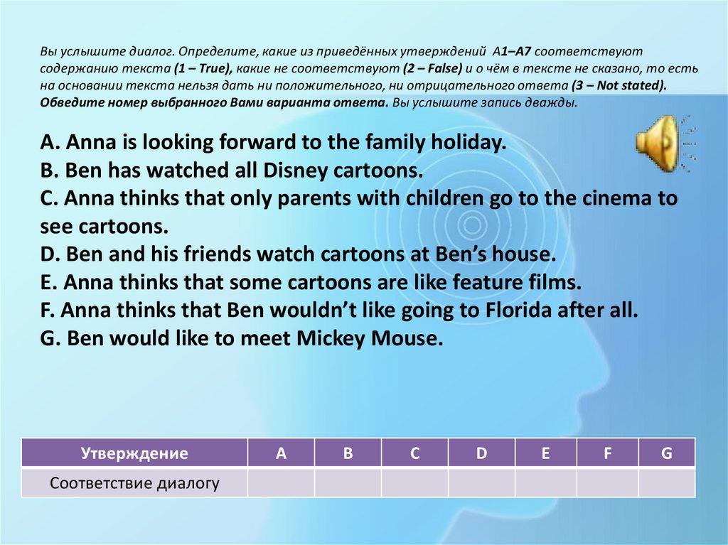 Вы услышите диалог. Определите, какие из приведённых утверждений А1–А7 соответствуютсодержанию текста (1 – True), какие не соответствуют (2 – False) и о чём в тексте не сказано, то есть