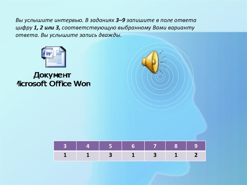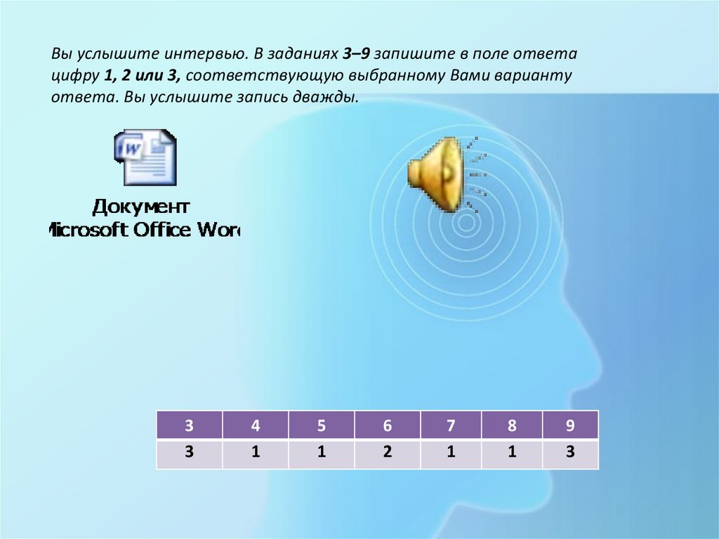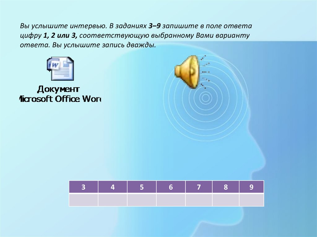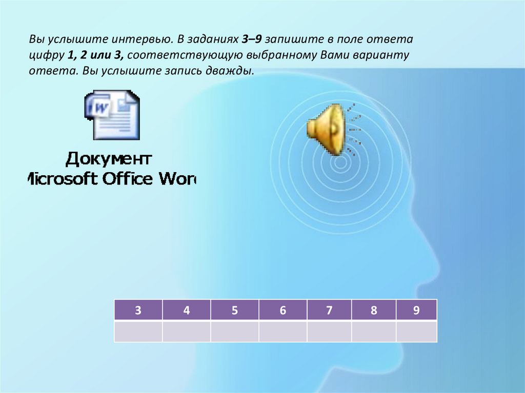 Вы услышите интервью. В заданиях 3–9 запишите в поле ответацифру 1, 2 или 3, соответствующую выбранному Вами варианту