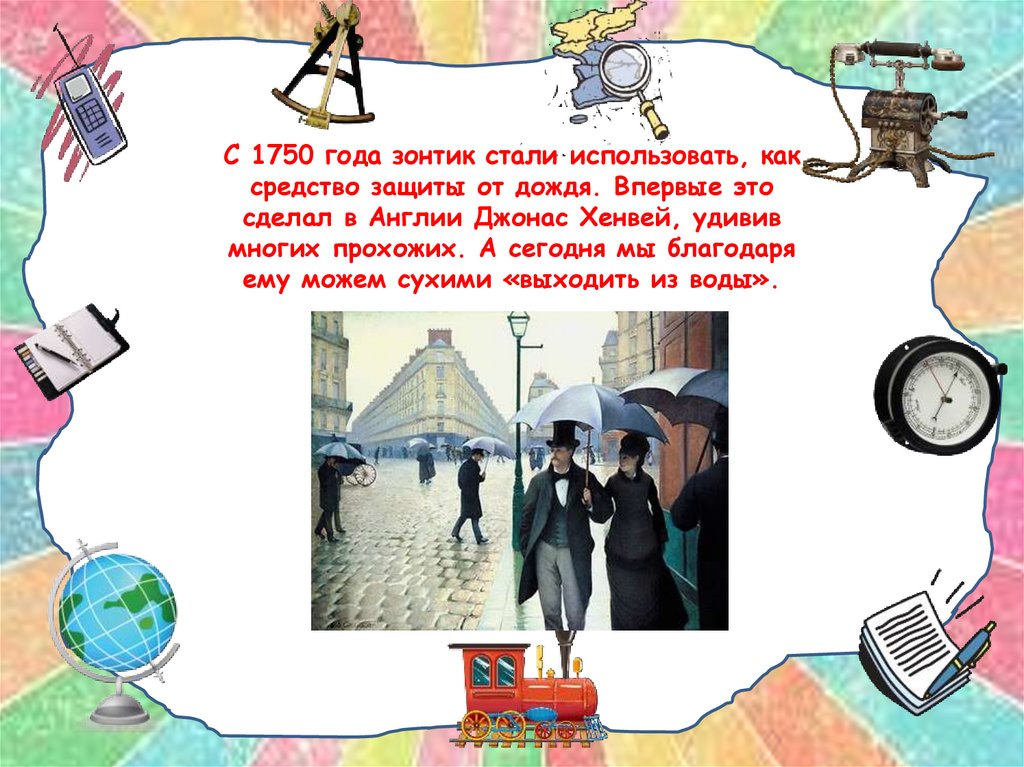 С 1750 года зонтик стали использовать, каксредство защиты от дождя. Впервые это