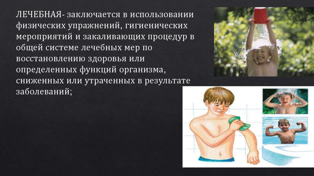 ЛЕЧЕБНАЯ- заключается в использованиифизических упражнений, гигиенических