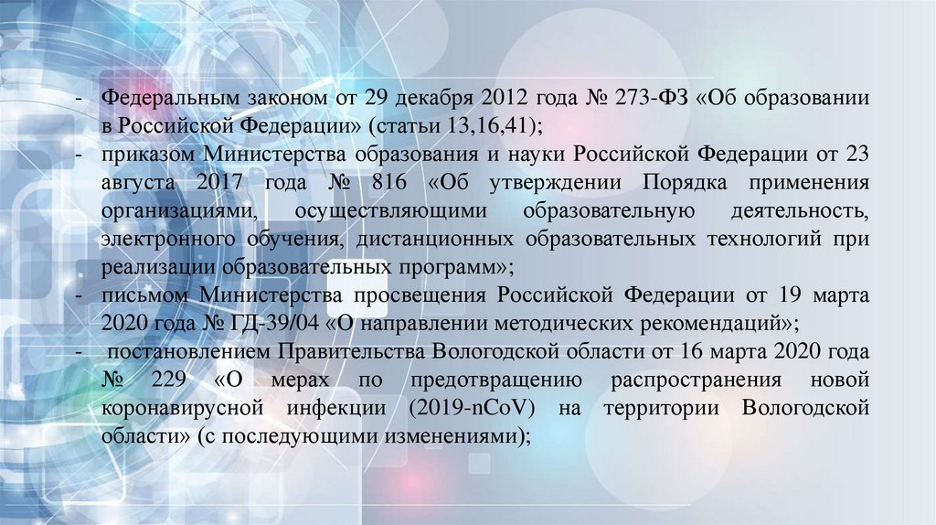 - Федеральным законом от 29 декабря 2012 года № 273-ФЗ «Об образованиив Российской Федерации» (статьи 13,16,41);