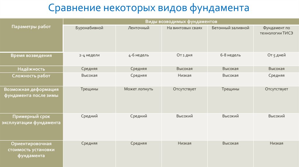 Сравнение некоторых видов фундамента;