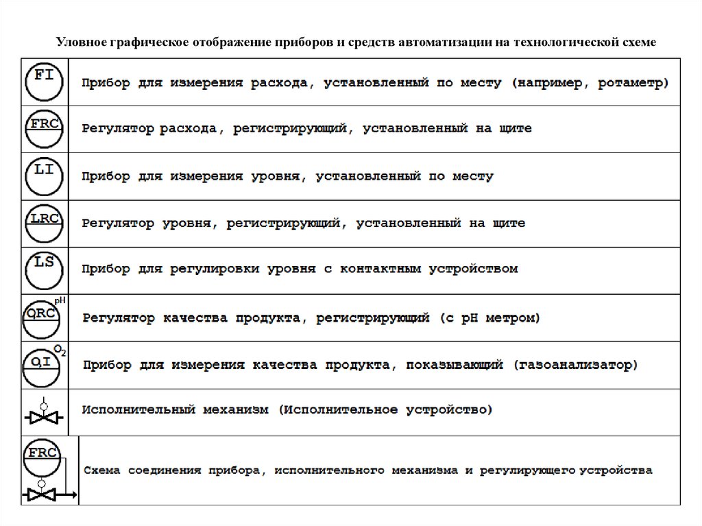 Основные условные обозначения измеряемых и регулируемых величин на технологической схемеИсполнительные устройства состоят пневматического,