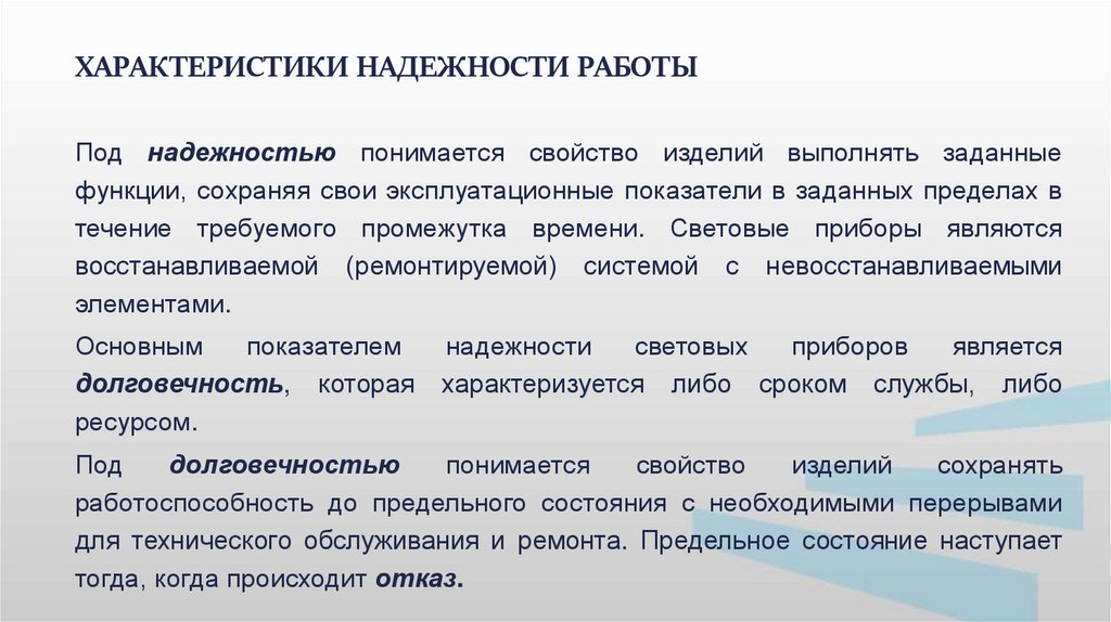 ХАРАКТЕРИСТИКИ НАДЕЖНОСТИ РАБОТЫПод надежностью понимается свойство изделий выполнять заданные