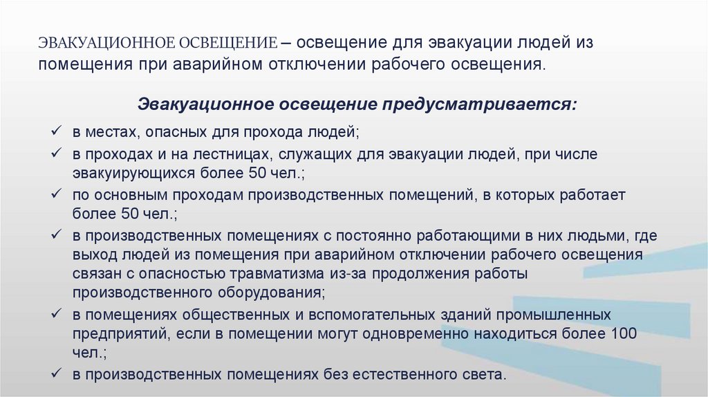 ЭВАКУАЦИОННОЕ ОСВЕЩЕНИЕ – освещение для эвакуации людей изпомещения при аварийном отключении рабочего освещения.