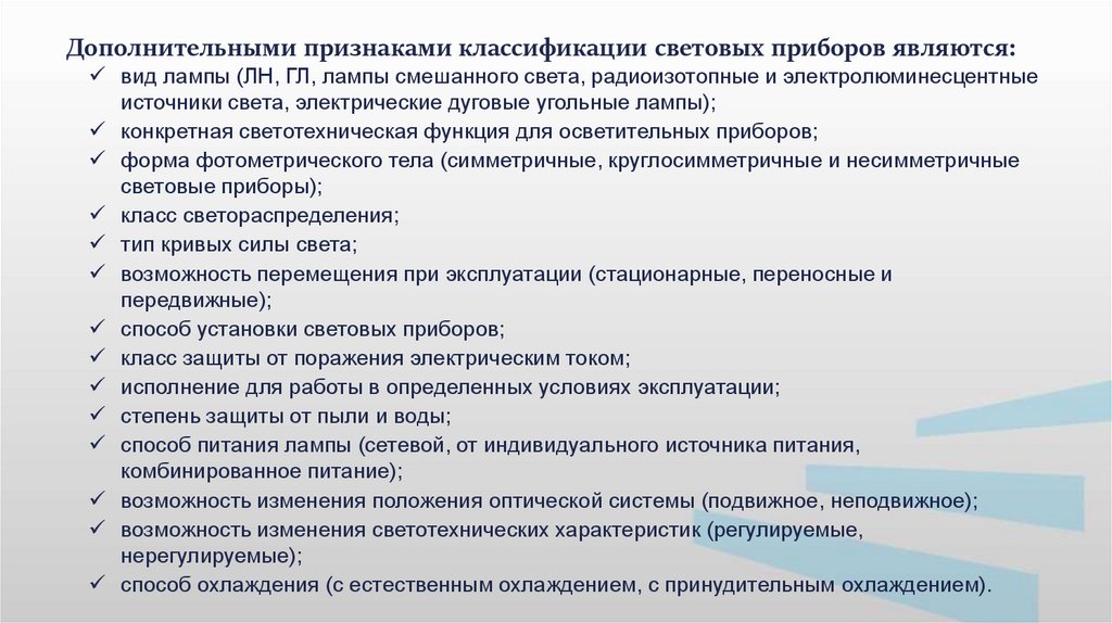 Дополнительными признаками классификации световых приборов являются:вид лампы (ЛН, ГЛ, лампы смешанного света, радиоизотопные и электролюминесцентные