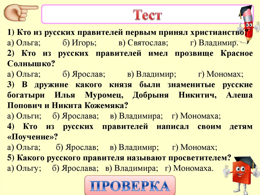1) Кто из русских правителей первым принял христианство?а) Ольга;
