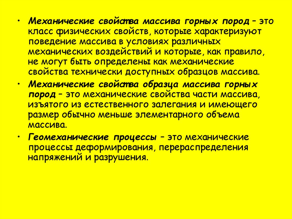 • Механические свойст ва массива горных пород – этокласс физических свойств, которые характеризуют