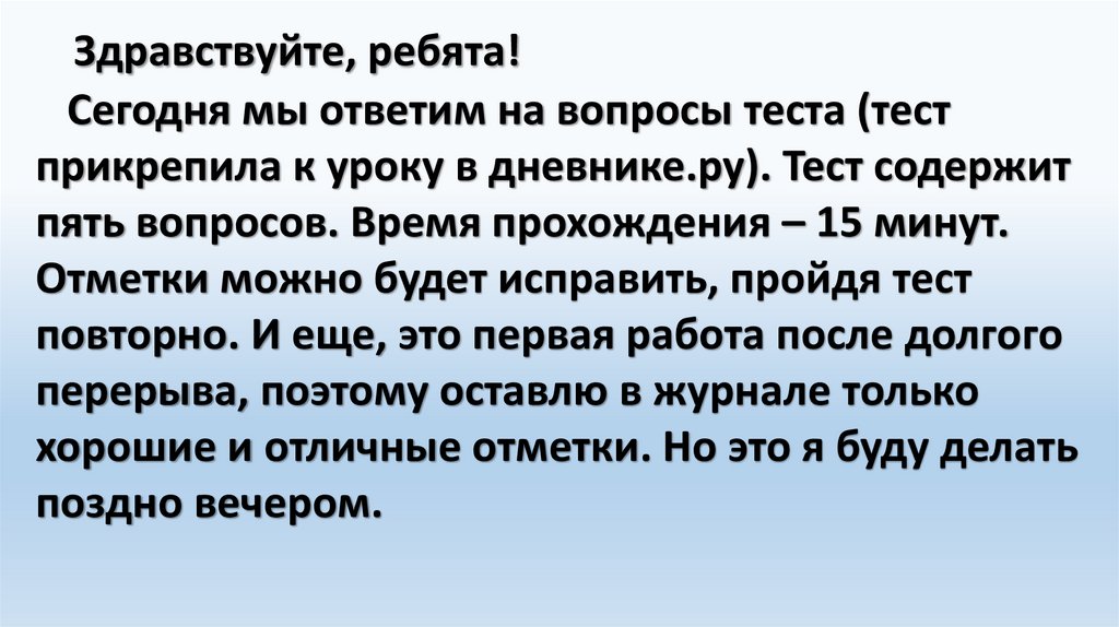 Здравствуйте, ребята!Сегодня мы ответим на вопросы теста (тест