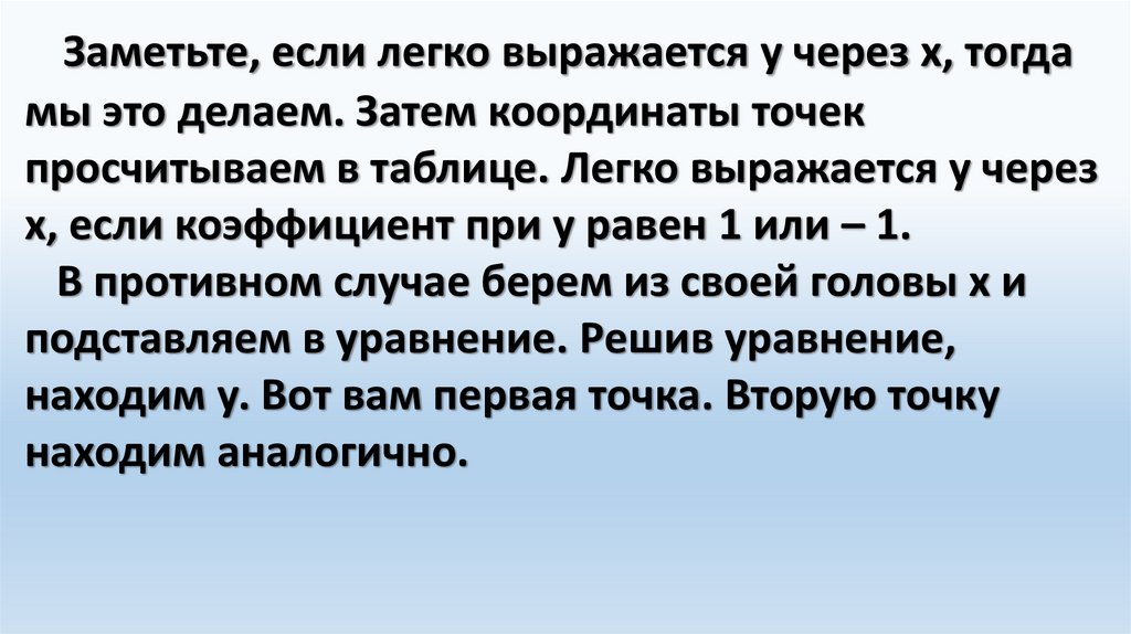 Заметьте, если легко выражается у через х, тогдамы это делаем. Затем координаты точек