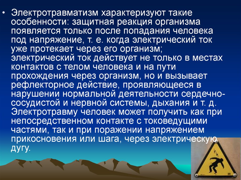 • Электротравматизм характеризуют такиеособенности: защитная реакция организма