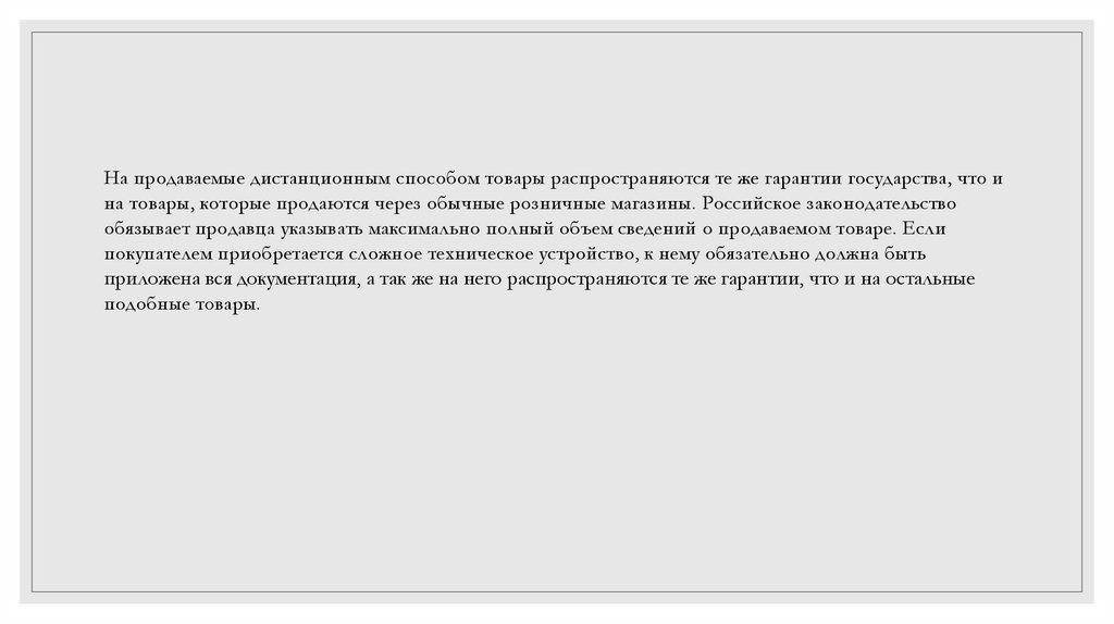 На продаваемые дистанционным способом товары распространяются те же гарантии государства, что ина товары, которые продаются через обычные розничные магазины. Российское законодательство