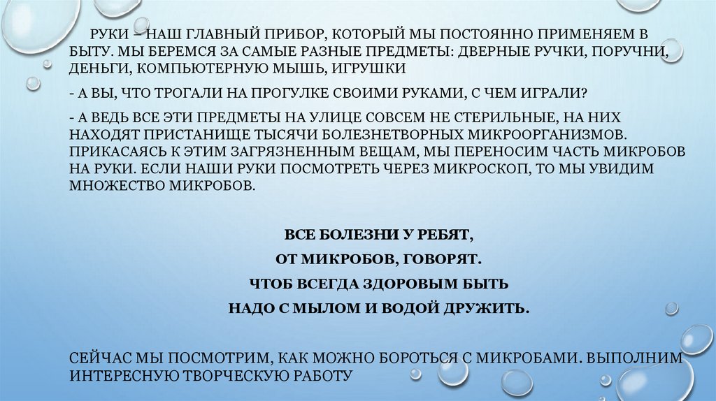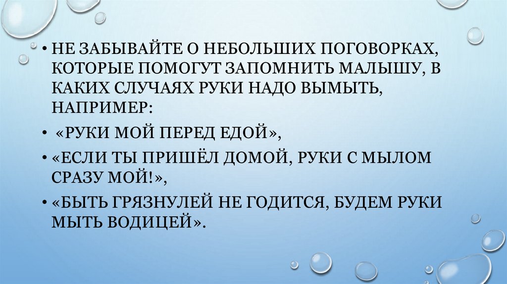 • РУКИ НАДО ЧИСТО МЫТЬ, РУКАВА НЕЛЬЗЯ МОЧИТЬ.