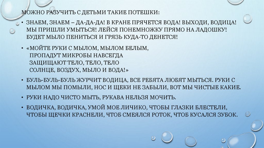 МОЖНО РАЗУЧИТЬ С ДЕТЬМИ ТАКИЕ ПОТЕШКИ:• ЗНАЕМ, ЗНАЕМ – ДА-ДА-ДА! В КРАНЕ ПРЯЧЕТСЯ ВОДА! ВЫХОДИ, ВОДИЦА!