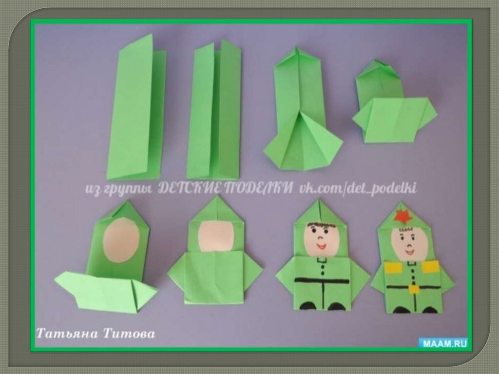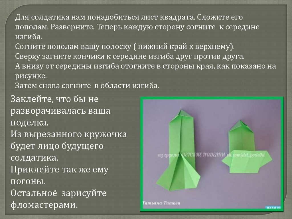 Для солдатика нам понадобиться лист квадрата. Сложите егопополам. Разверните. Теперь каждую сторону согните к середине