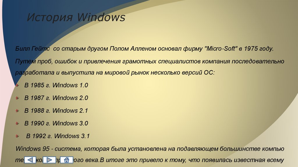 История WindowsБилл Гейтс со старым другом Полом Алленом основал фирму "Micro-Soft" в 1975 году.