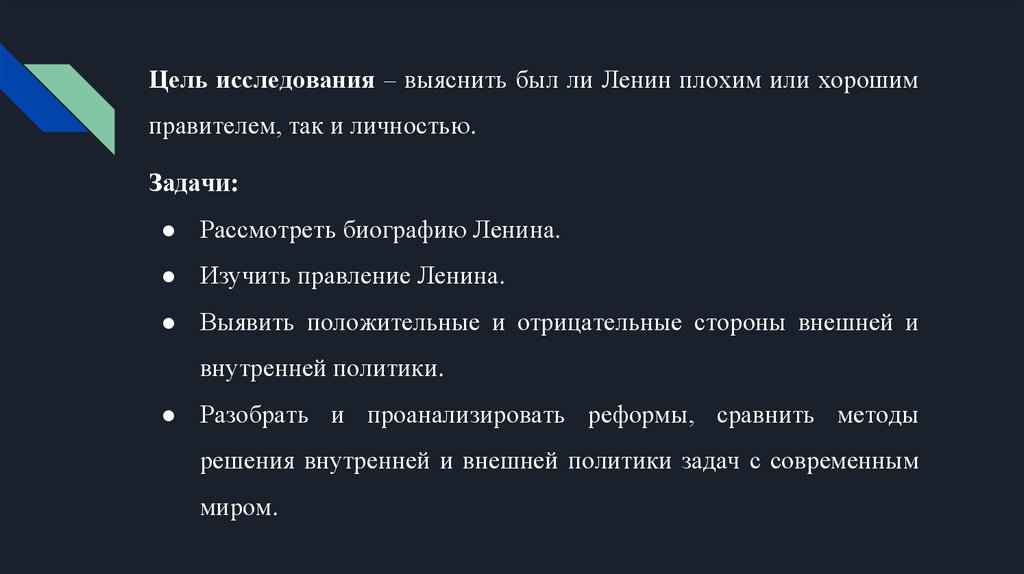 Цель исследования – выяснить был ли Ленин плохим или хорошимправителем, так и личностью.