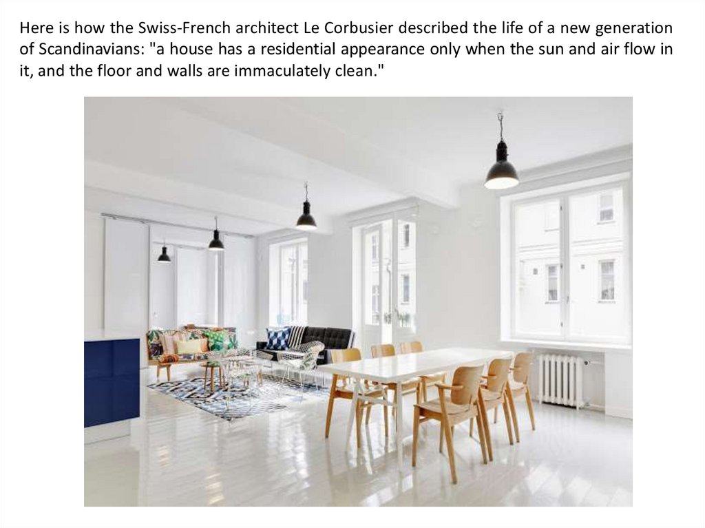 Here is how the Swiss-French architect Le Corbusier described the life of a new generationof Scandinavians: "a house has a residential appearance only when the sun and air flow in