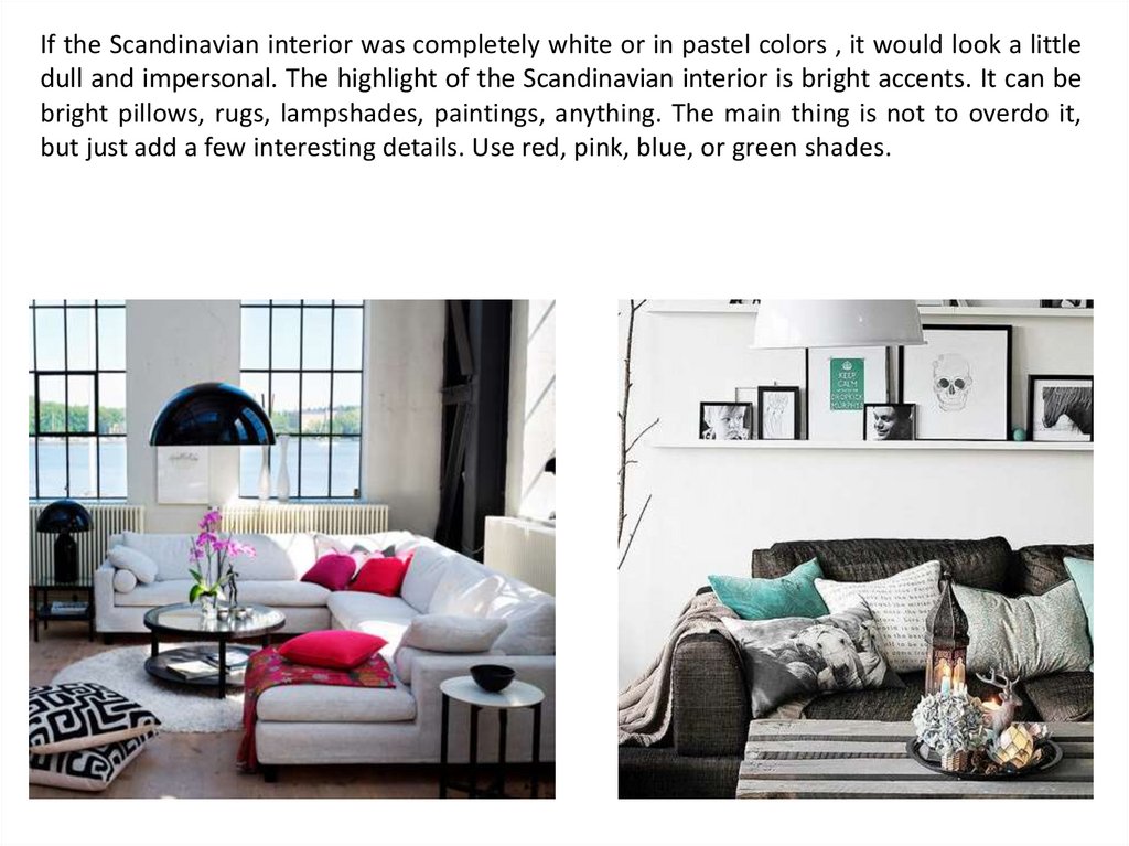 If the Scandinavian interior was completely white or in pastel colors , it would look a littledull and impersonal. The highlight of the Scandinavian interior is bright accents. It can be