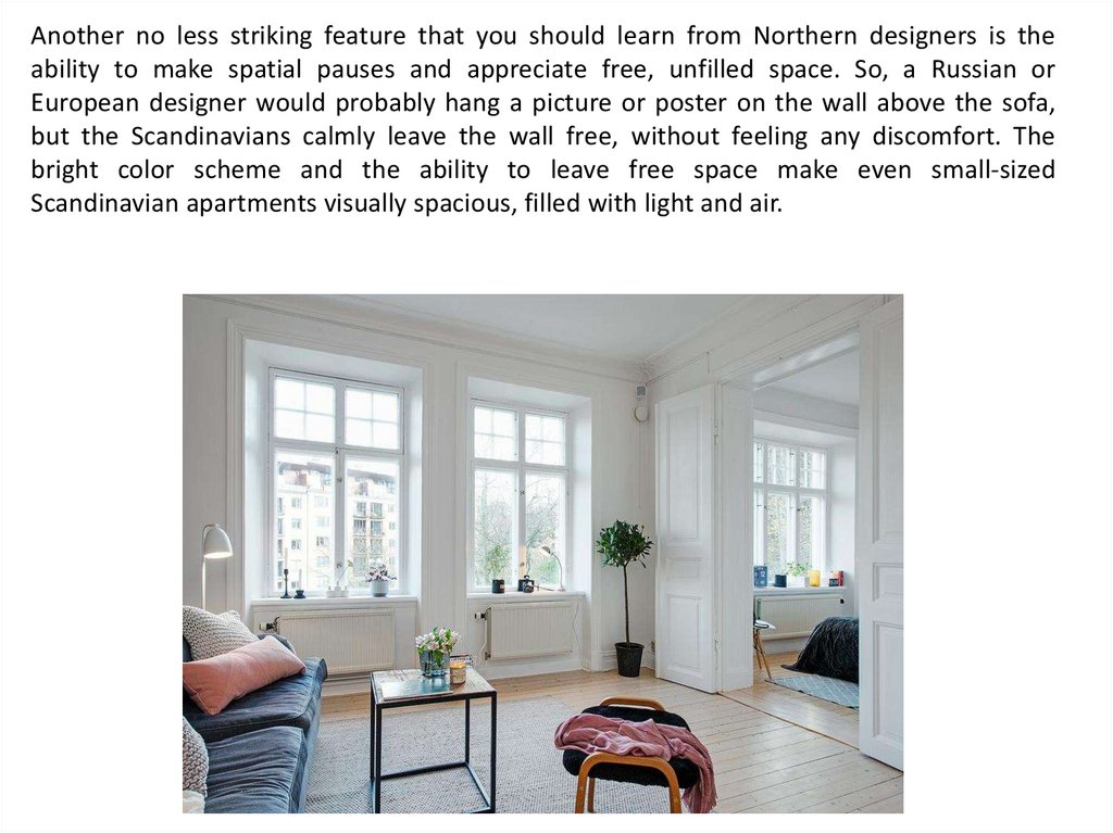 Another no less striking feature that you should learn from Northern designers is theability to make spatial pauses and appreciate free, unfilled space. So, a Russian or