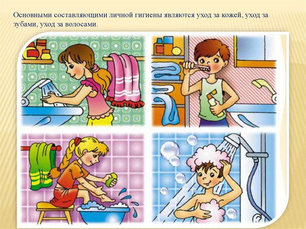 Основными составляющими личной гигиены являются уход за кожей, уход зазубами, уход за волосами.