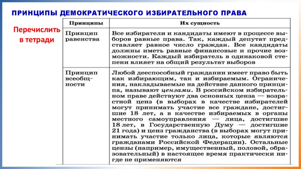 ПРИНЦИПЫ ДЕМОКРАТИЧЕСКОГО ИЗБИРАТЕЛЬНОГО ПРАВАПеречислить