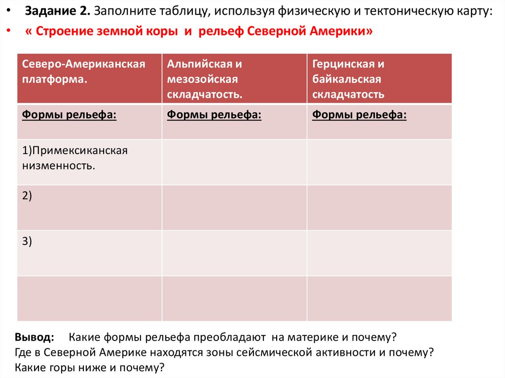 • Задание 2. Заполните таблицу, используя физическую и тектоническую карту:• « Строение земной коры и рельеф Северной Америки»