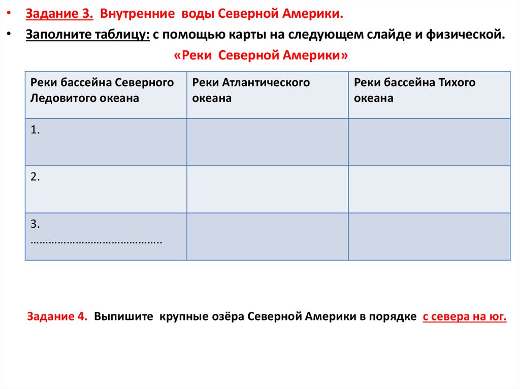 • Задание 3. Внутренние воды Северной Америки.• Заполните таблицу: с помощью карты на следующем слайде и физической.