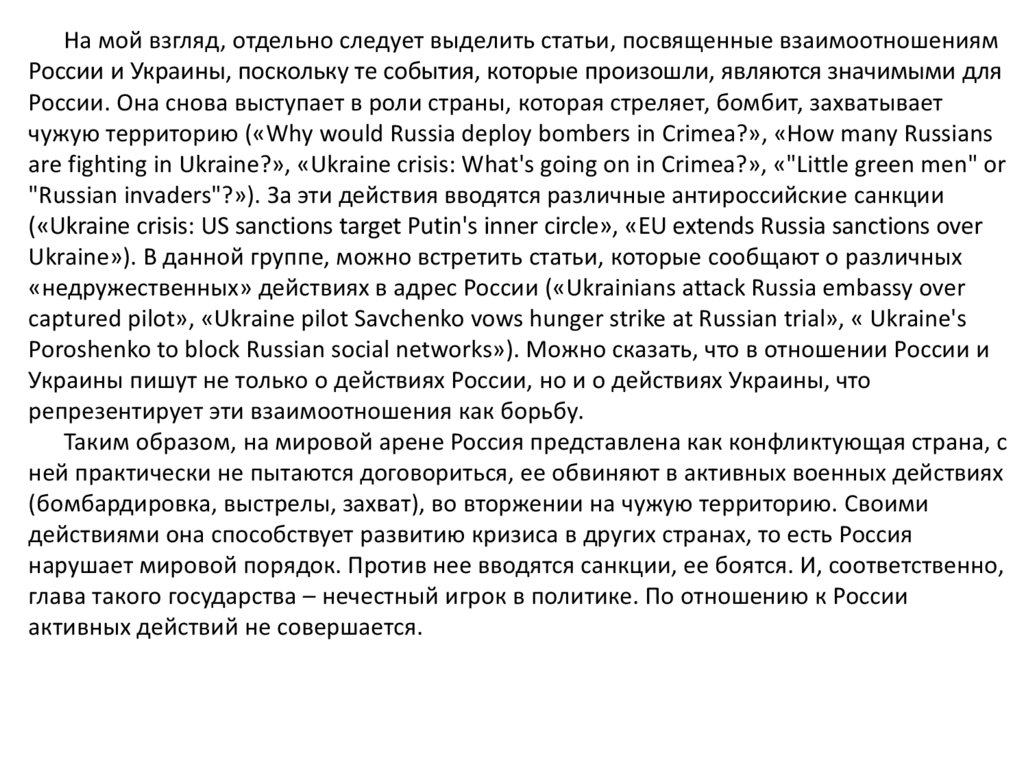 На мой взгляд, отдельно следует выделить статьи, посвященные взаимоотношениямРоссии и Украины, поскольку те события, которые произошли, являются значимыми для
