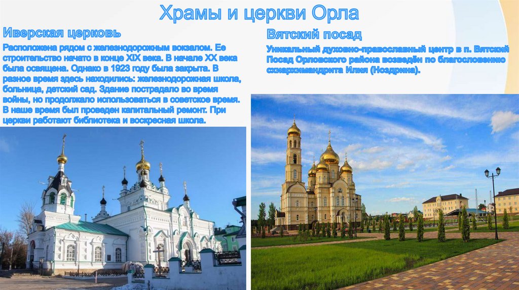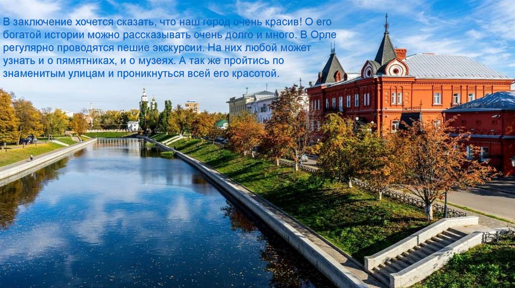 В заключение хочется сказать, что наш город очень красив! О егобогатой истории можно рассказывать очень долго и много. В Орле