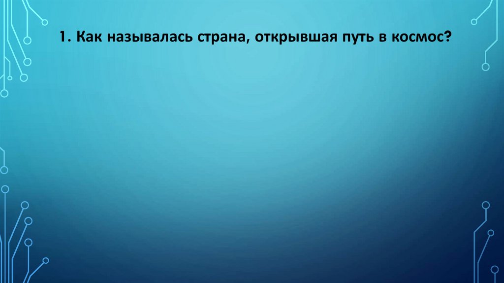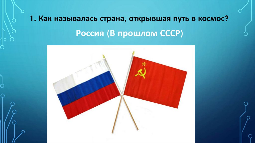 1. Как называлась страна, открывшая путь в космос?Россия (В прошлом СССР)