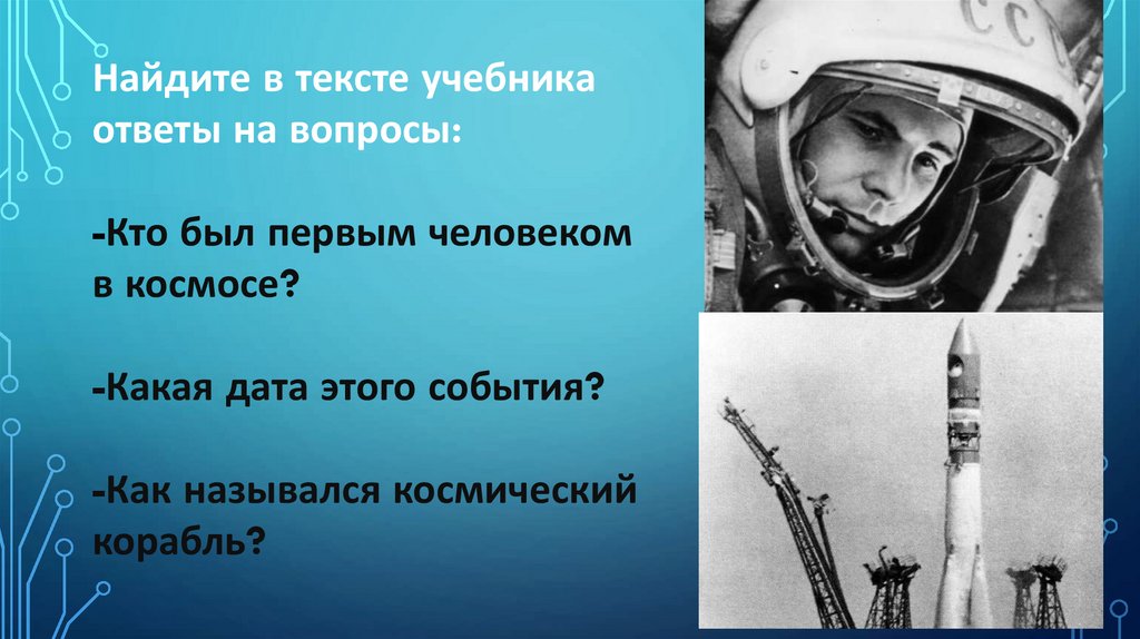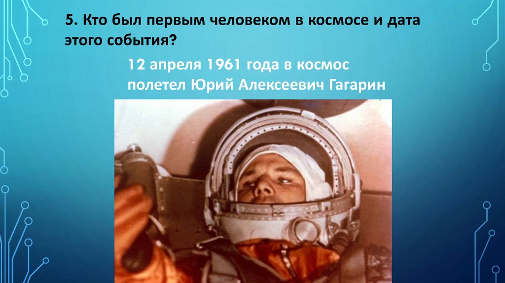 5. Кто был первым человеком в космосе и датаэтого события?