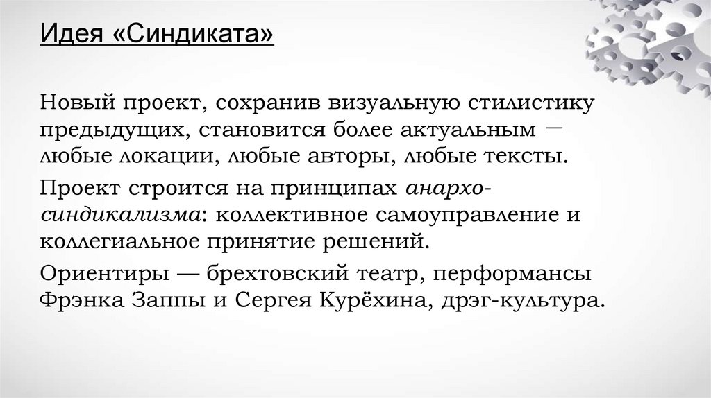 Идея «Синдиката»Новый проект, сохранив визуальную стилистику