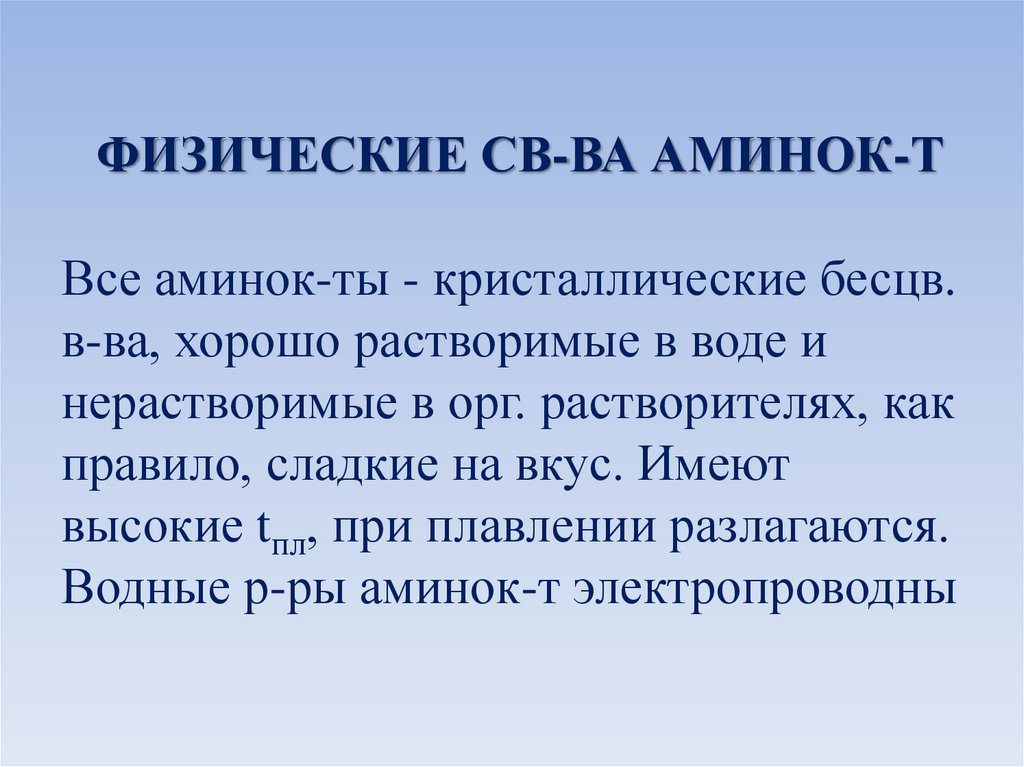 ФИЗИЧЕСКИЕ СВ-ВА АМИНОК-ТВсе аминок-ты - кристаллические бесцв.