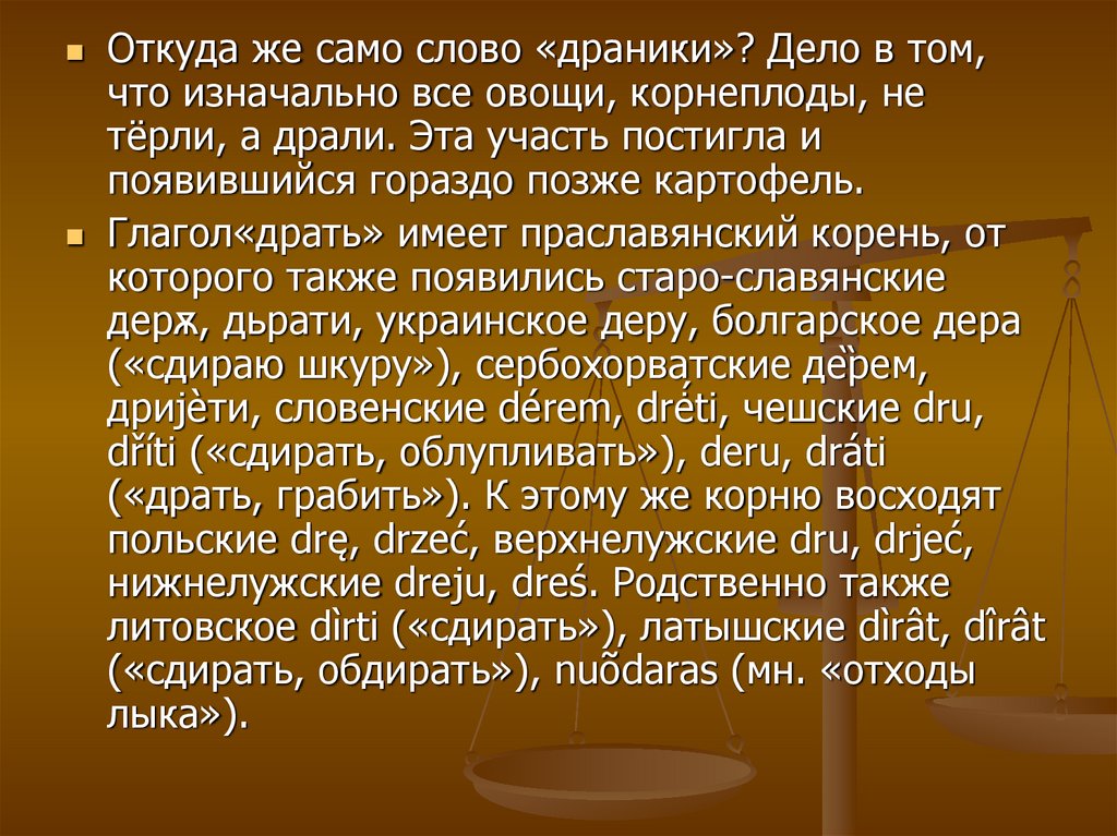 Откуда же само слово «драники»? Дело в том,что изначально все овощи, корнеплоды, не
