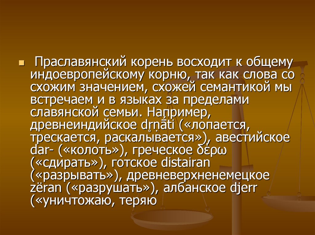 Праславянский корень восходит к общемуиндоевропейскому корню, так как слова со