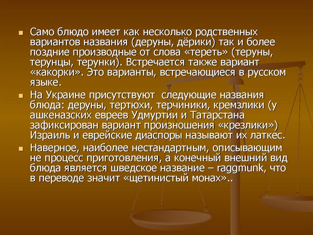 Само блюдо имеет как несколько родственныхвариантов названия (деруны, дёрики) так и более
