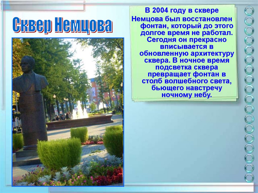 В 2004 году в сквереНемцова был восстановлен