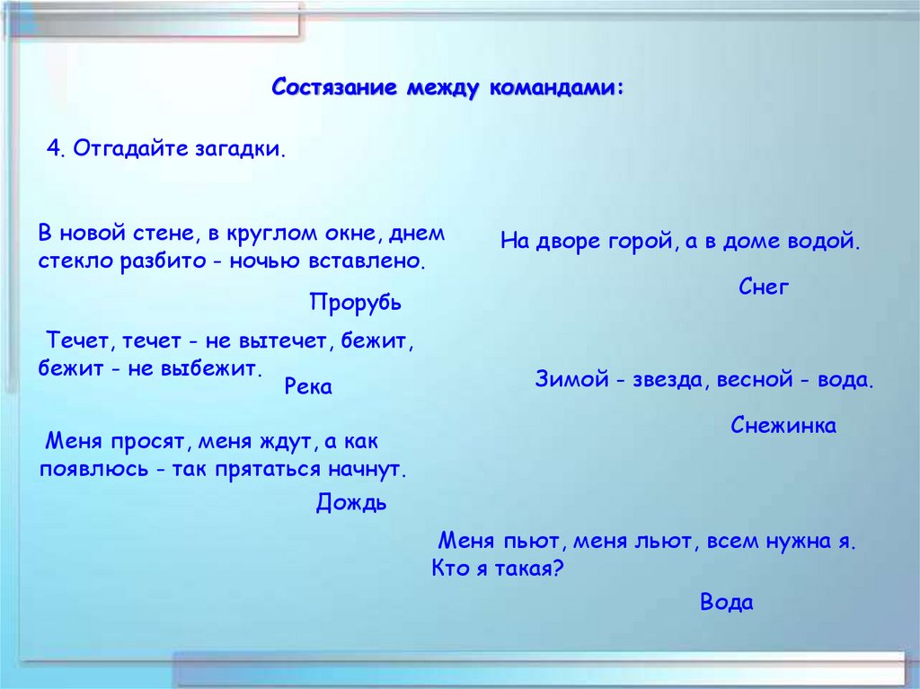 Состязание между командами:4. Отгадайте загадки.