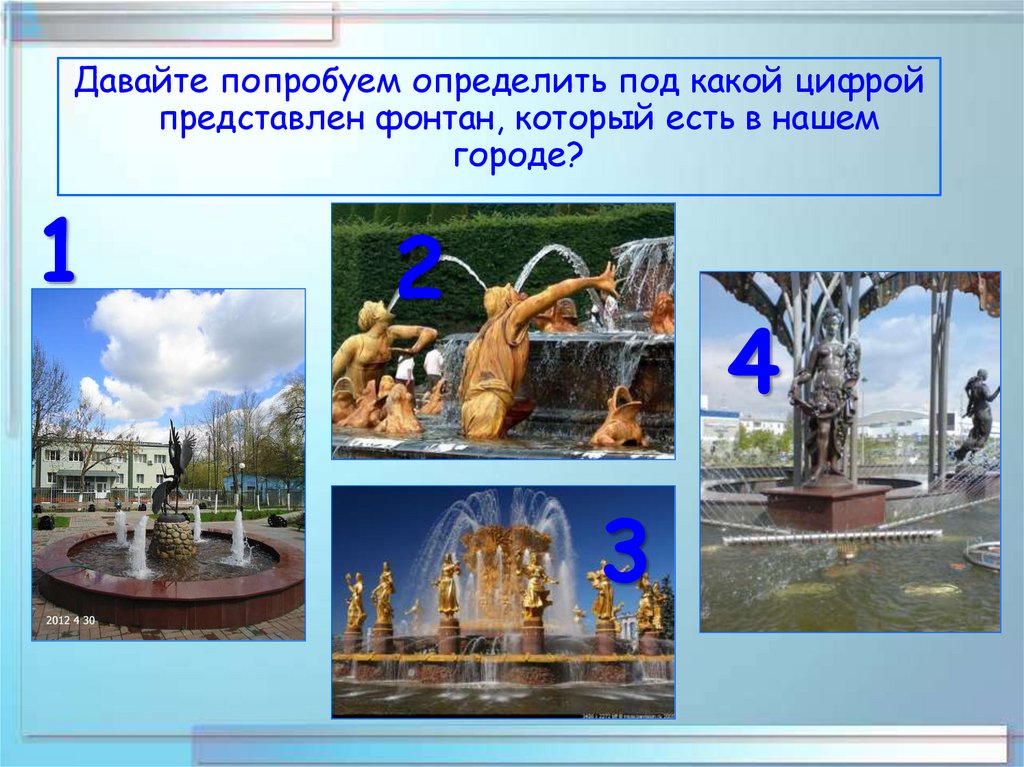 Давайте попробуем определить под какой цифройпредставлен фонтан, который есть в нашем