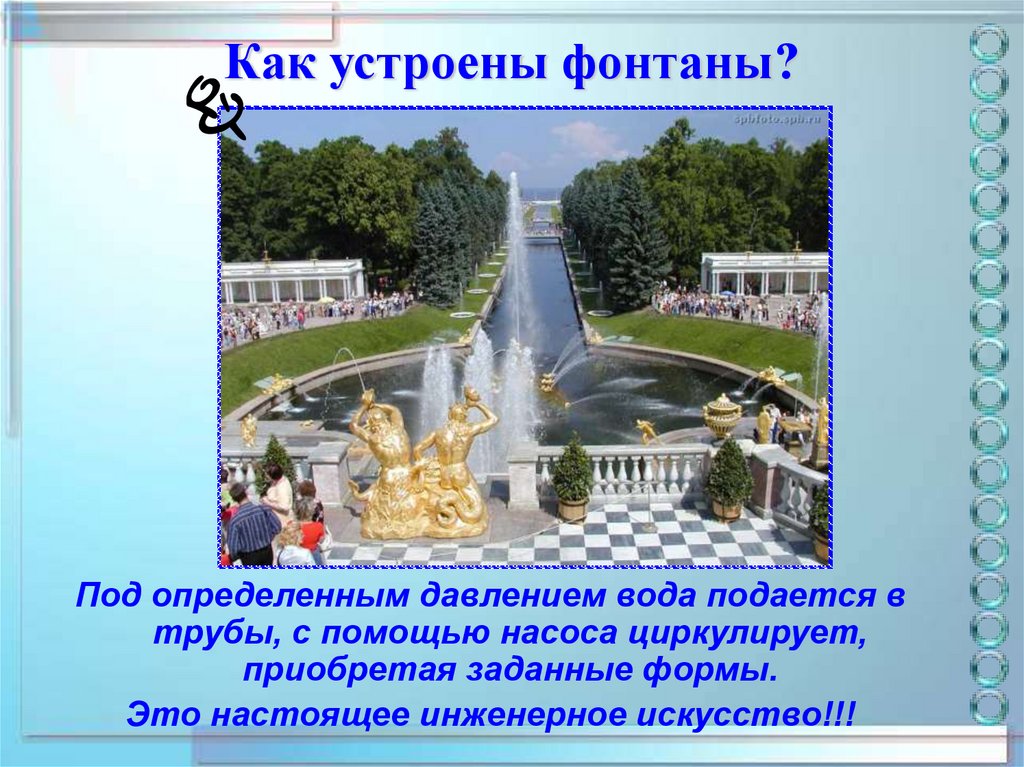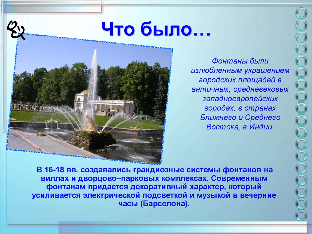 3. Первоначально фонтаны сооружались преимущественно только как источник питьевой воды. Затем сочетание движущейся воды с