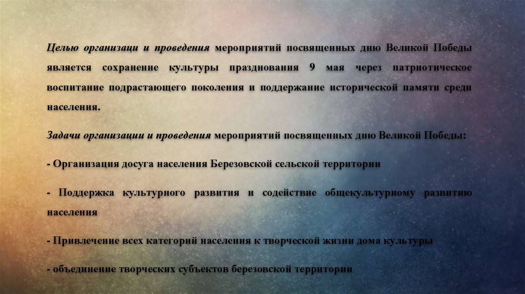Целью организаци и проведения мероприятий посвященных дню Великой Победыявляется сохранение культуры празднования 9 мая через патриотическое