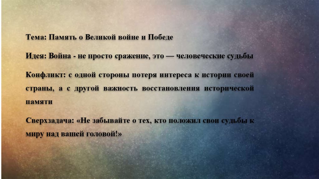 Тема: Память о Великой войне и ПобедеИдея: Война - не просто сражение, это — человеческие судьбы