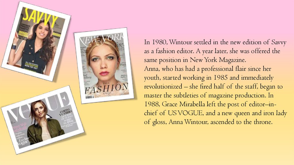 In 1980, Wintour settled in the new edition of Savvyas a fashion editor. A year later, she was offered the